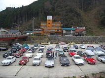 堤防にクラシックカーが並ぶ、天気もよくてのどかな雰囲気。 桜の時期には早かったのがちょっと残念。 そして地元の方々に見送られ、参加車は蒜山高原を経て湯原温泉へ出発。