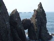 城崎温泉 から 竹野へは、山の中の<9>を走る。 途中に 「鋳物師戻峠」 という変わった名前の峠があった。 竹野 から海岸沿いに少し進むと奇妙な岩が! 「はさかり岩」という名前で、上から丸い岩が転がってきて挟まったのではなく、アーチ状の岩の真ん中が落ちてきたのが侵食されて出来たものだそうだ。