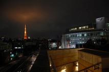 外に出ると、小雨が降り出したところ。 東京タワーの照明が低く垂れこめた雨雲に反映している。