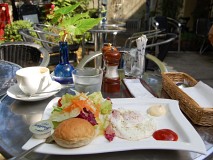 まだ朝の9時頃なので、観光客より犬の散歩やジョギングの人の方が多い。 沿道のお店はほとんど準備中だったが【カフェ テラッツァ (Cafe Terrazza)】 というお店が開いていた。 朝の爽やかなテラス席でモーニングセット(700円)をいただく。